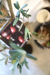 <マンザニロ>という品種で、横に広がる樹形で、小さく丸みを帯びた硬めの葉を持つ種類です。 果実は3グラムほどで大きく、りんごの形に似ています。